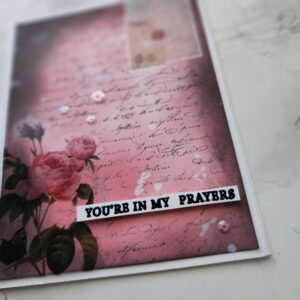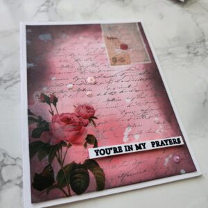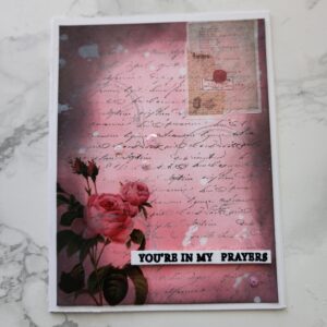 Mixed Media Greeting cards with sentiment “You’re in my prayers”. This unique, one of a kind greeting card was created using blending inks, stamps, stickers, paint and embossing techniques. Measures 5.5×4.25″.