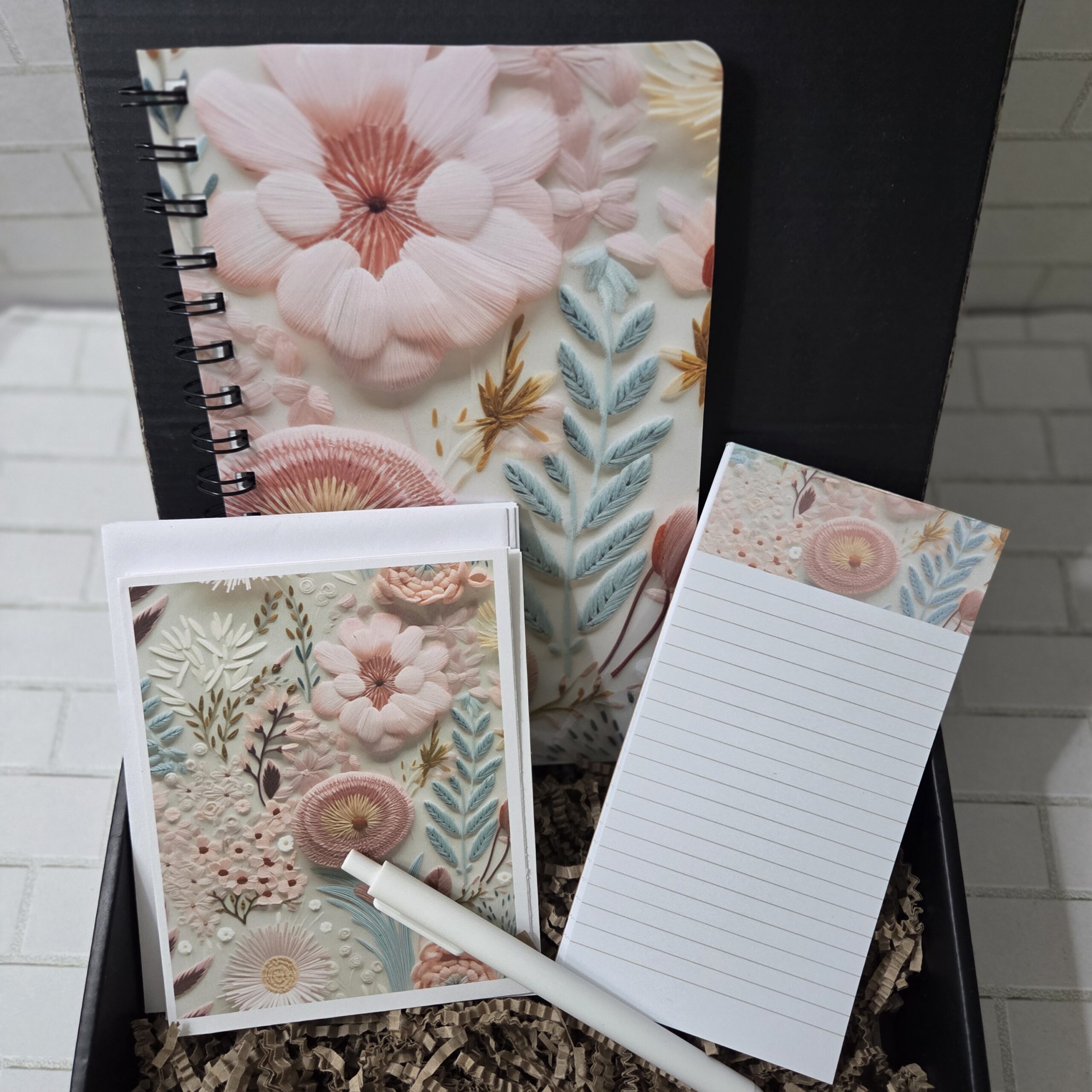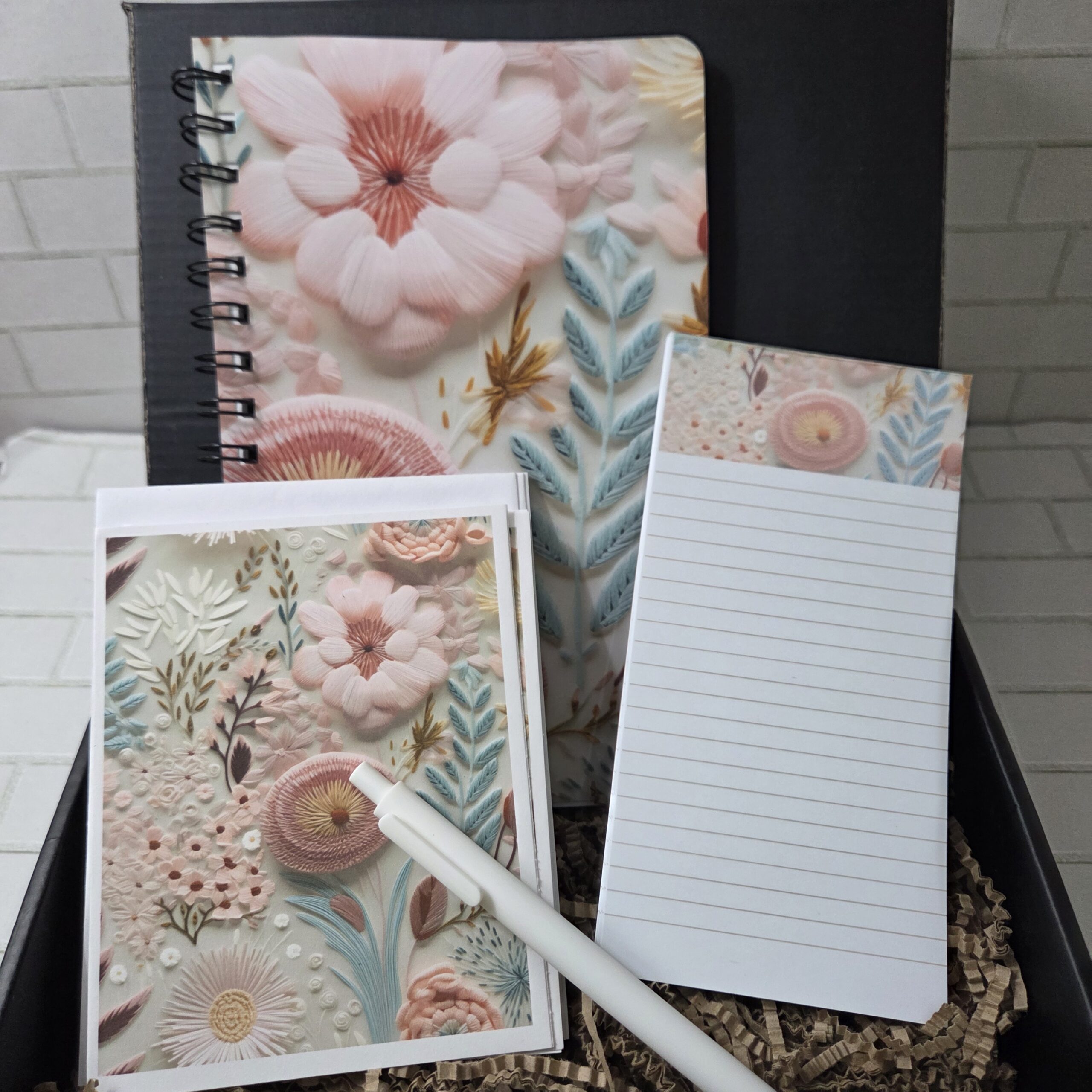 Floral Stationary/Journal Set, w/Hand Bound Spiral Journal, 6 Matching Notecards, Notepad and Pen